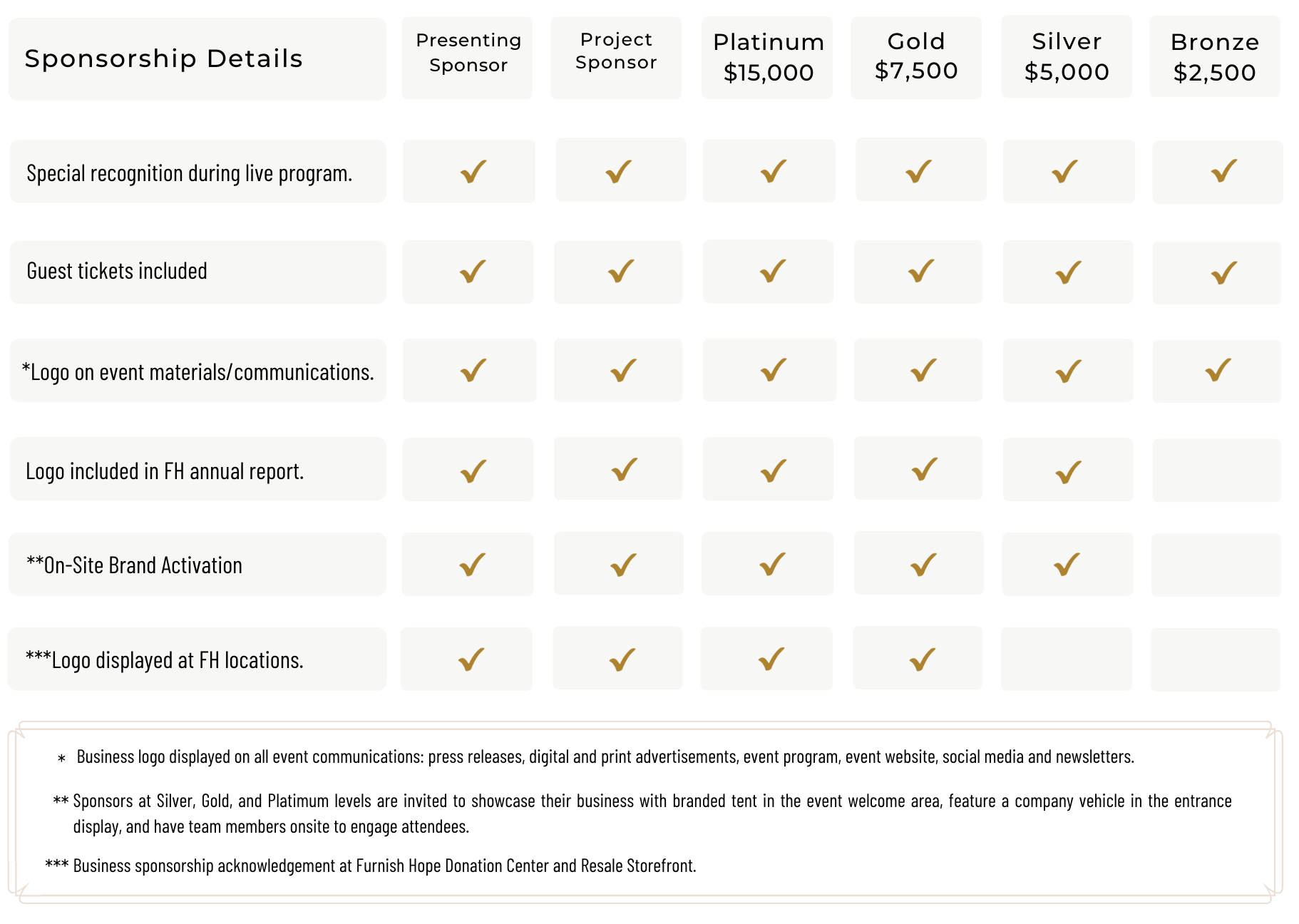 We would be honored for you to consider making an in-kind donation or joining us as a sponsor to help us reach our $400,000 goal.
